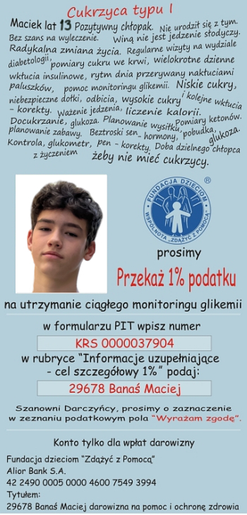 Maciek lat 15. Pozytywny chłopak. Nie urodził się z tym. Bez szans na wyleczenie. Winą nie jest jedzenie słodyczy. Radykalna zmiana życia. Regularne wizyty na oddziale diabetologii. Pomiary cukru we krwi. Wielokrotne dzienne wkłucia insulinowe. Rytm dnia przerywanych nakłuciami paluszków. Pomoc monitoringu glikemii. Niskie cukry, niebezpieczne dołki, odbicia, wysokie cukry i kolejne wkłucia - korekty. Choroba współistniejąca - celiakia. Ważenie jedzenia, liczenie kalorii. Glukoza - docukrzanie. Planowanie wysiłku, pomiary ketonów. Planowanie zabawy. Beztroski sen. Czuwanie, hormony, pobudka, glukoza. Kontrola, glukometr, pen - korekty. Doba dzielnego chłopca z życzeniem żeby nie mieć cukrzycy.